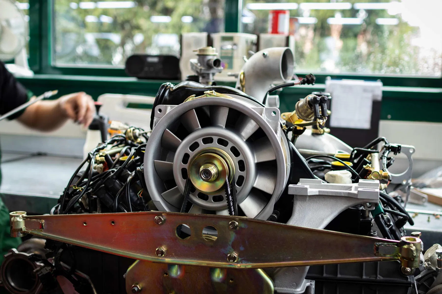 Na druhém konci dílny stojí prototyp RUF CTR Anniversary, který RUF ukázal v roce 2017 k 30. výročí Yellowbirdu. A hned vedle běží montážní linka motorového oddělení. Tady RUF staví vlastní vodou chlazený 3,6litrový plochý šestiválec boxer. Kořeny vedou k návrhu Hanse Mezgera, ale RUF ho modernizoval v tuhosti, chlazení i hmotnosti. Čtyřventilová jednotka se blýská závodní technikou: výfuk z Inconelu jako ve Formuli 1, k tomu titanové ojnice a kované písty. A z CTR motorů z toho tahají přes 700 hp.